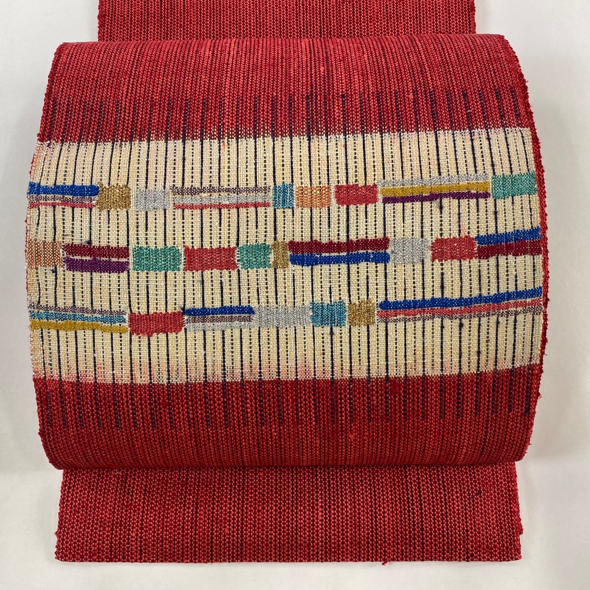 - 名古屋帯 美品 秀品 落款 八寸名古屋帯 縞 幾何学模様 金銀糸 赤 正絹 【中古】