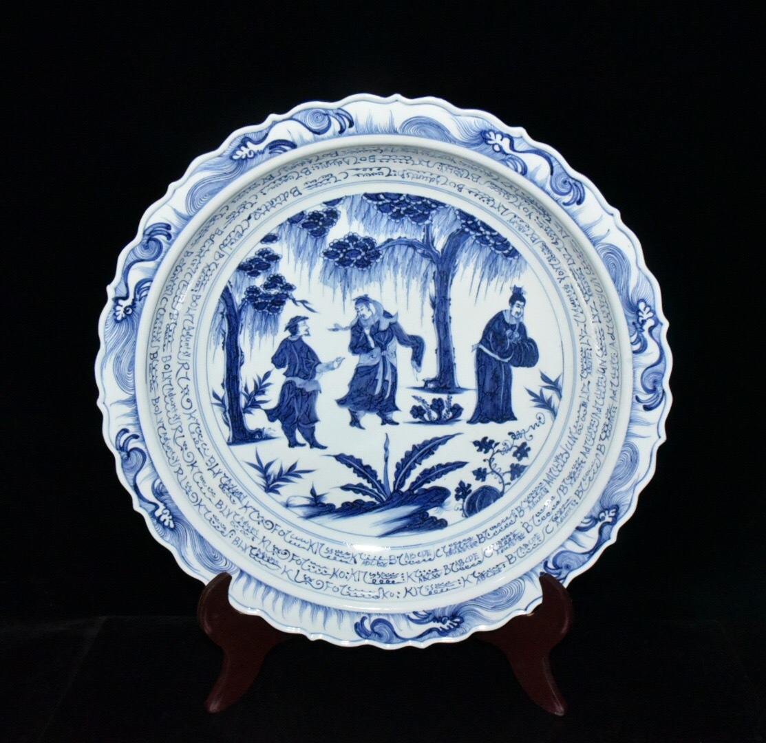 - 【超珍館蔵】元 古陶瓷品 青花 波斯文 三顧茅廬紋 供盤 陶藝 古賞物 古董品 古美術品 時代物 旧家蔵出 稀少珍蔵品
