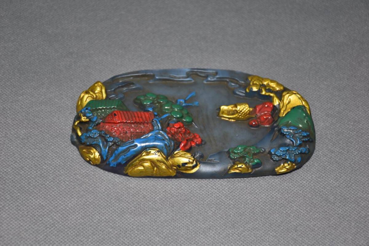 - 【超珍館蔵】琉璃製 細密彫 描金 彩繪 松樹硯台 置物 賞物 古賞物 古董品 古美術品 時代物 旧家蔵出 稀少珍蔵品