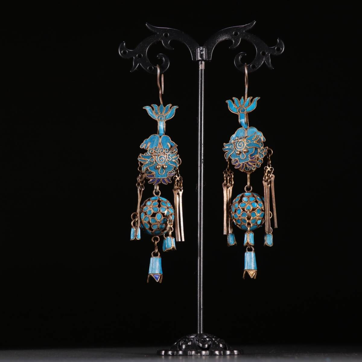 - 8+GV7379「東洋美術」 中国骨董 人間国宝 【銀メッキの青い「天からの祝福」のイヤリング】 旧物 孤品 珍品 収蔵価値が高い