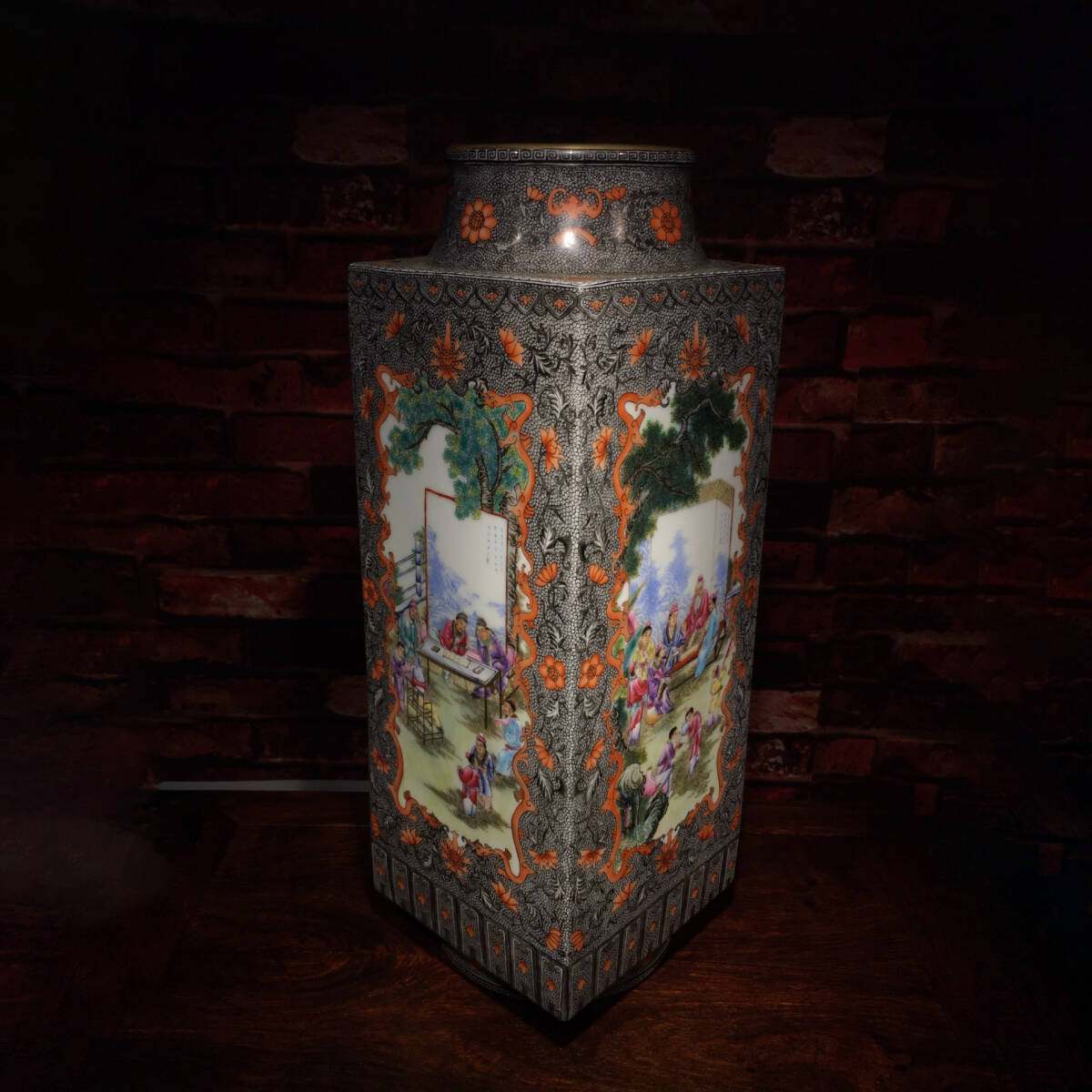 - 8+DS6621「東洋美術」 中国骨董 人間国宝 磁器製品【窓付きエナメル磁器の四角い花瓶】 旧物 孤品 珍品 陶磁器 収蔵価値が高い