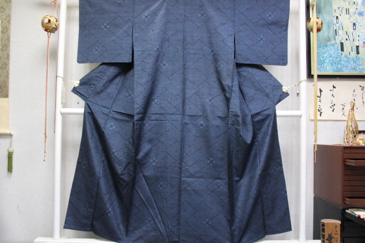 > きもの今昔8918 単衣紬のきもの 広衿セブセ付き単衣仕立 紺色蚊絣の崩れ菱格子柄 表地汚れなし 身丈155cm