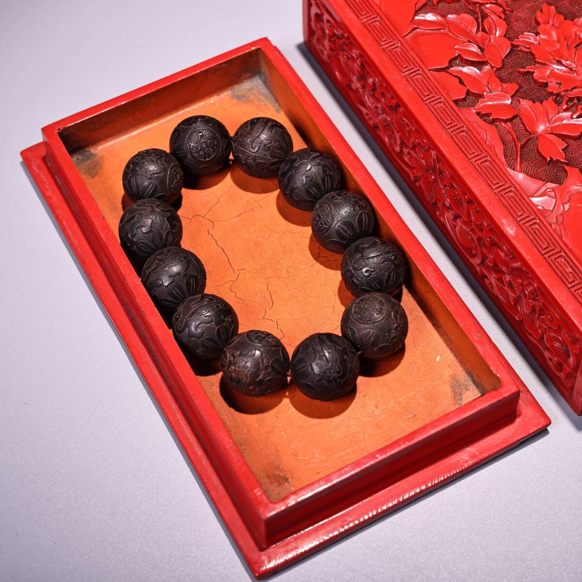 - 清 乾清宮藏 古沈香彫 奇楠 黑油 老料 香木 手鏈 手串 腕輪 念珠 箱付 置物 時代物 古董品 骨董 旧家蔵出し 唐物 中国古玩 古美術品