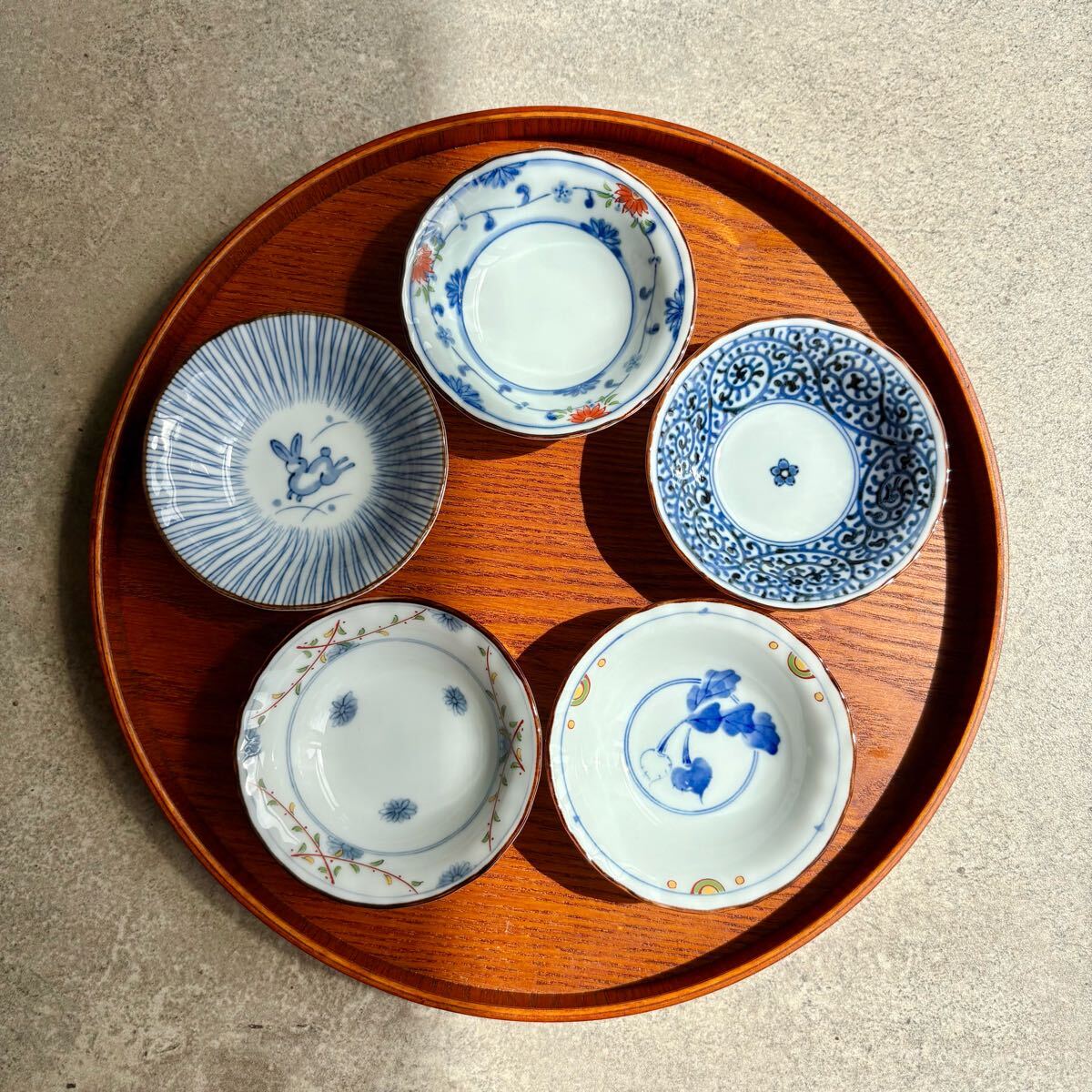 > 染錦絵変り 小付揃 小皿 5点セット 日本製 美濃焼 波佐見焼 豆皿 色絵 醤油皿 深小皿 食器セット 陶器 うさぎ 花柄 唐草 カブ