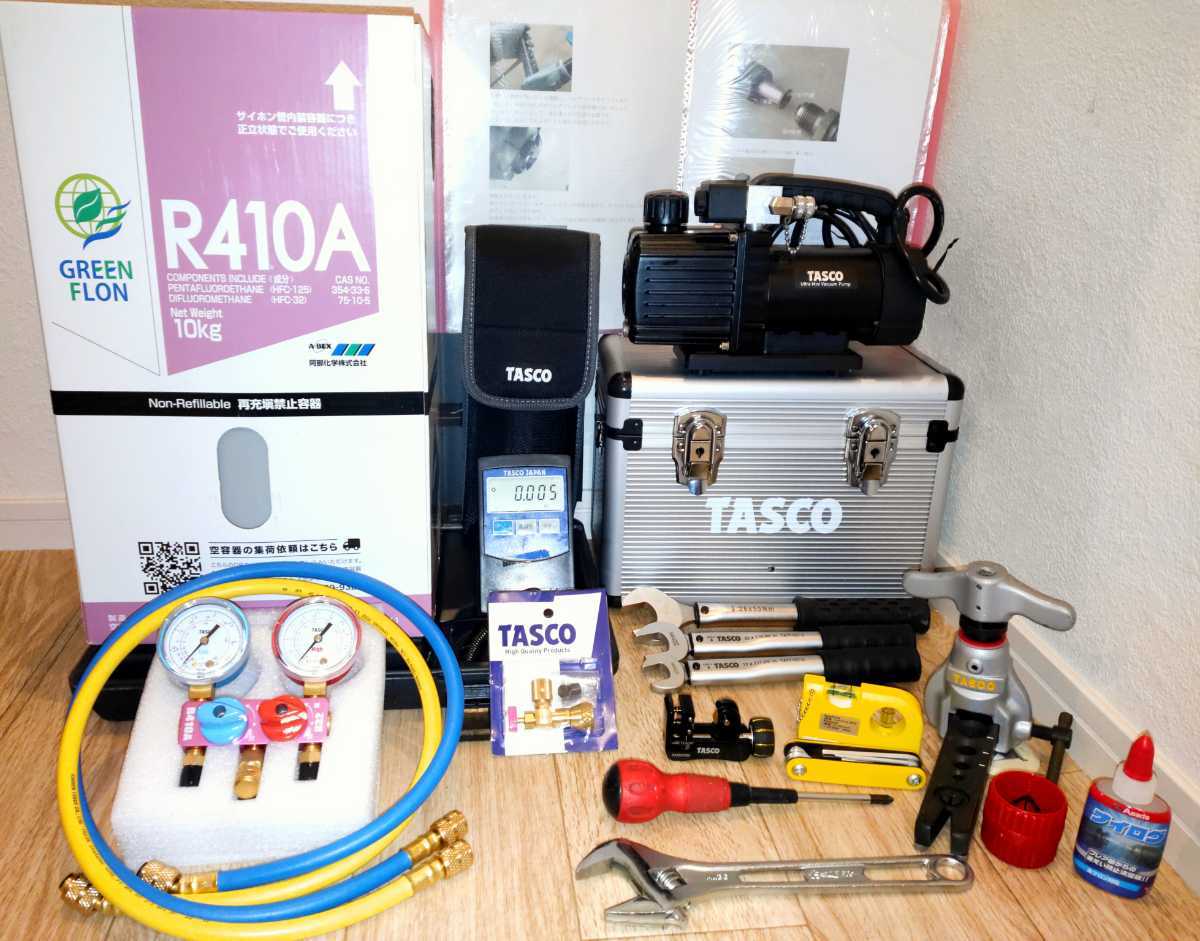 > ⑤R410A エアコン フロンガス 冷媒 ガスチャージ ガス充填フルセット1泊2日 レンタル タスコ 真空ポンプ トルクレンチ 日時指定可能