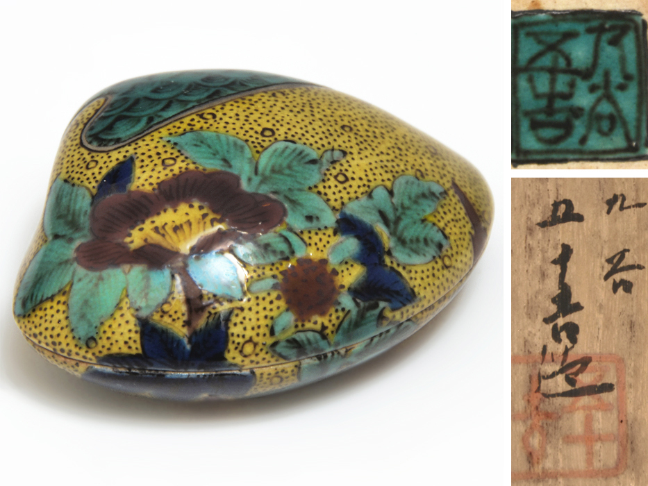 - 浅蔵五十吉 (造) 古九谷写 黄稲釉 牡丹文 貝形 香合 共箱 茶道具 香道具 陶磁器 u0850a