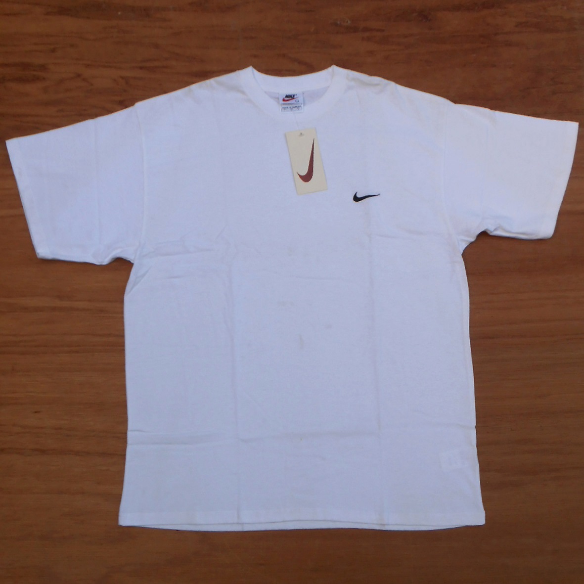 > 未使用 正規 '90s NIKE ナイキ 半袖 Tシャツ L 大きめ 白x黒 ホワイトxブラック XL スウォッシュ刺繍 デッドストック 白タグ ヴィンテージ