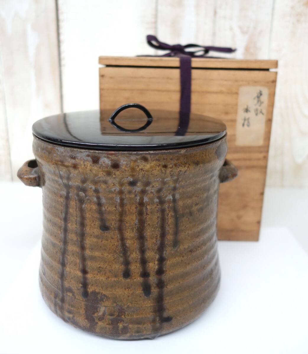 > 伝統工芸 工芸美術 レトロ *高取焼 TAKATORI *古高取耳付 一重口水指 水差 水器 みずさし *黒塗蓋付 木箱付*刻印 陶印等なし