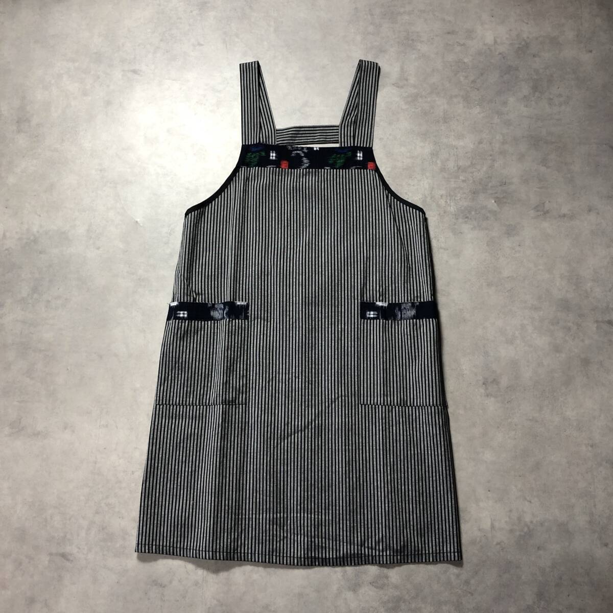 - WH055● (株)桑野:切替絣エプロン 黒ストライプ 久留米絣 日本製