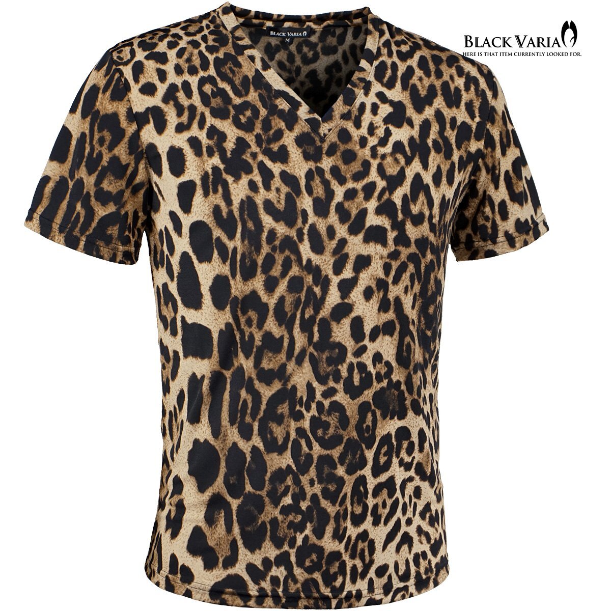 - 241308-brbk BLACK VARIA Tシャツ 半袖 Vネック 滲み ヒョウ柄 豹 レオパード スリム ストレッチ メンズ(ブラウン茶) M 派手