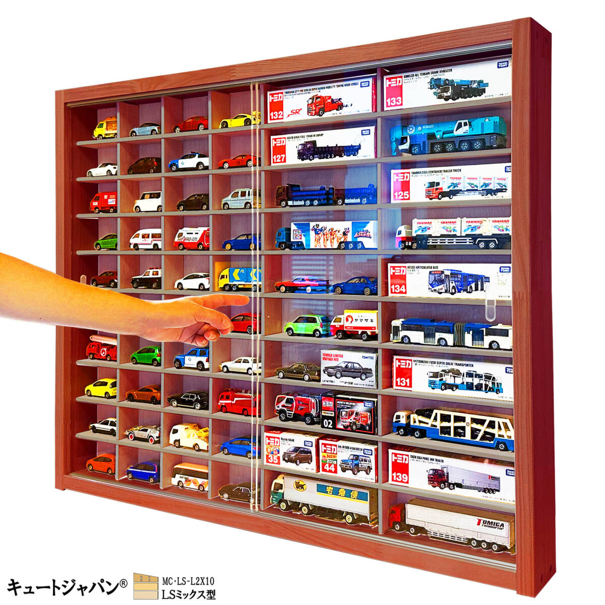 - 送料無料★【ミニカーケース】マホガニ色全塗装 トミカ40台・ロングトミカ20台 アクリル障子付 日本製 LSミックス型