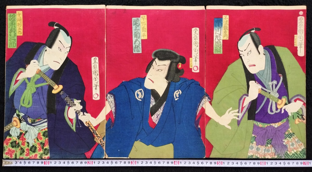 - 明治期/真作 豊原国周「天満宮国字掛額」本物浮世絵木版画 歌舞伎絵 役者絵 芝居絵 錦絵 大判 三枚続き 裏打ち
