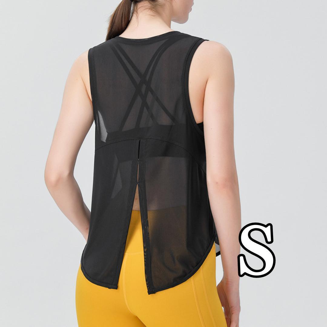 - スポーツウェア レディース メッシュ S 黒 ヨガウェア ノースリーブ 透け感 シースルー スリット ストレッチ タンクトップ FC26