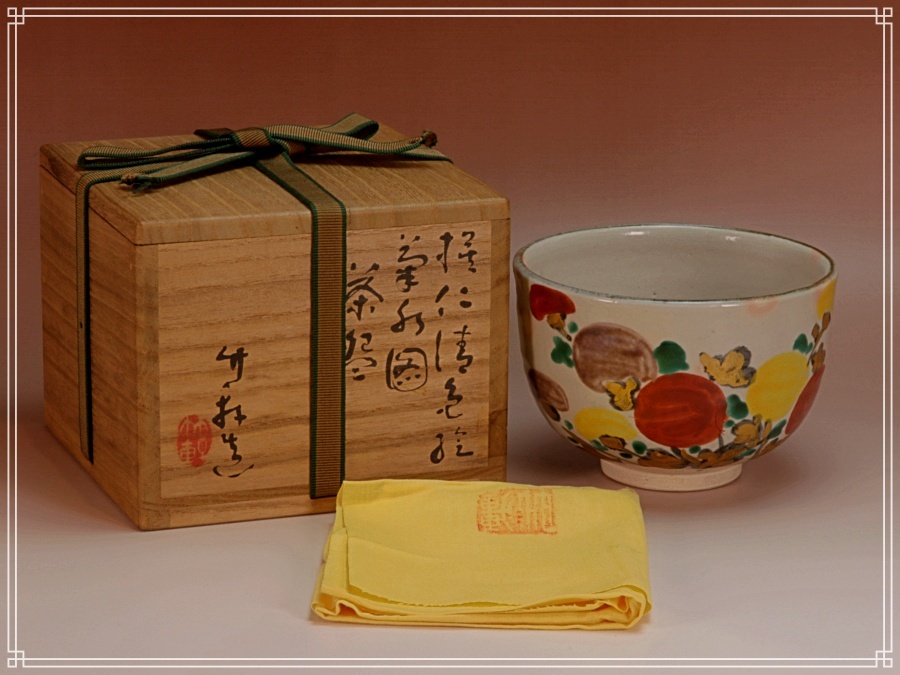 - 【ZEN】 初代 三浦竹軒造 模仁清色絵 菊水図 茶碗 茶道具 -保証品-