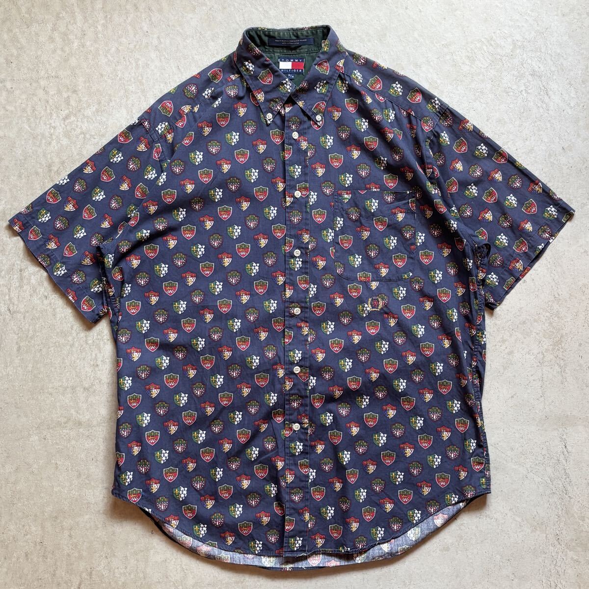 > 【90s】TOMMY HILFIGER トミーヒルフィガー ボタンダウン 半袖シャツ メンズ M 紺/NAVY 総柄 ロゴ プリント コットン vintage 正規 古着