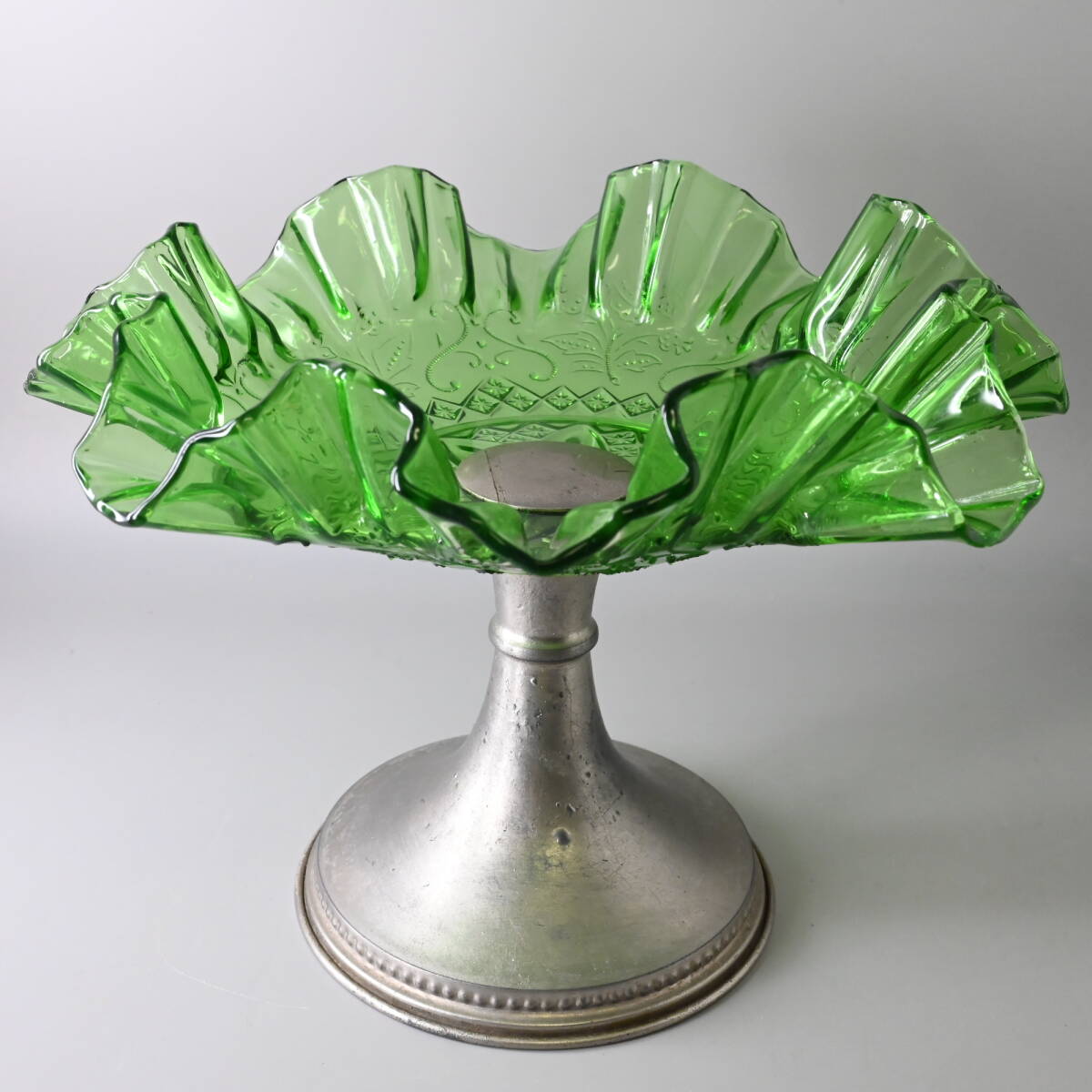 - 11492 フリル ガラス コンポート皿 緑 グリーン 径23cm 高16.5cm プレスガラス 明治 大正ロマン 氷コップ 色硝子
