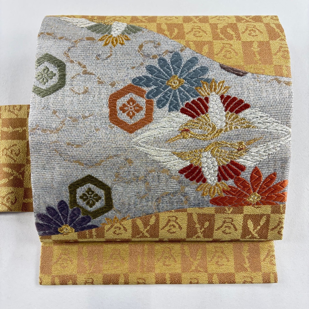 - 名古屋帯 美品 逸品 向鶴 菊唐草 金糸 箔 銀色 正絹 【中古】