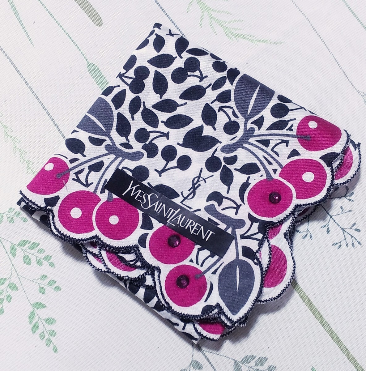 > 送料無料! イヴ サンローラン サクランボ チェリー 柄 ハンカチ小さめ 未使用品 ストーン付き