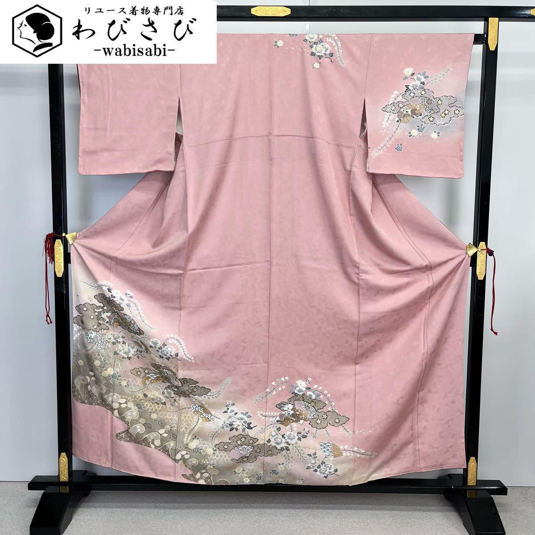 > 訪問着 波に雲模様 地紙 花柄模様 金彩 曙色 K-4070 着物 きもの kimono 和服 和装 中古 リサイクル着物 【送料無料】
