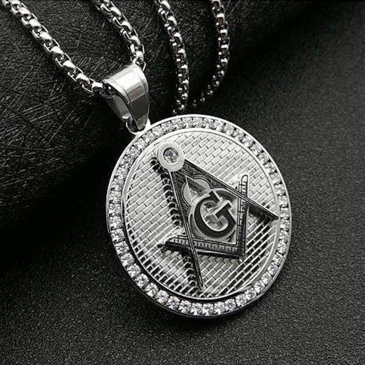 - ネックレス フリーメイソン 5cm プロビデンスの目 メンズ シルバー ラインストーン 丸型 アクセサリー 大きい 金属 男性用 目立つ t8363