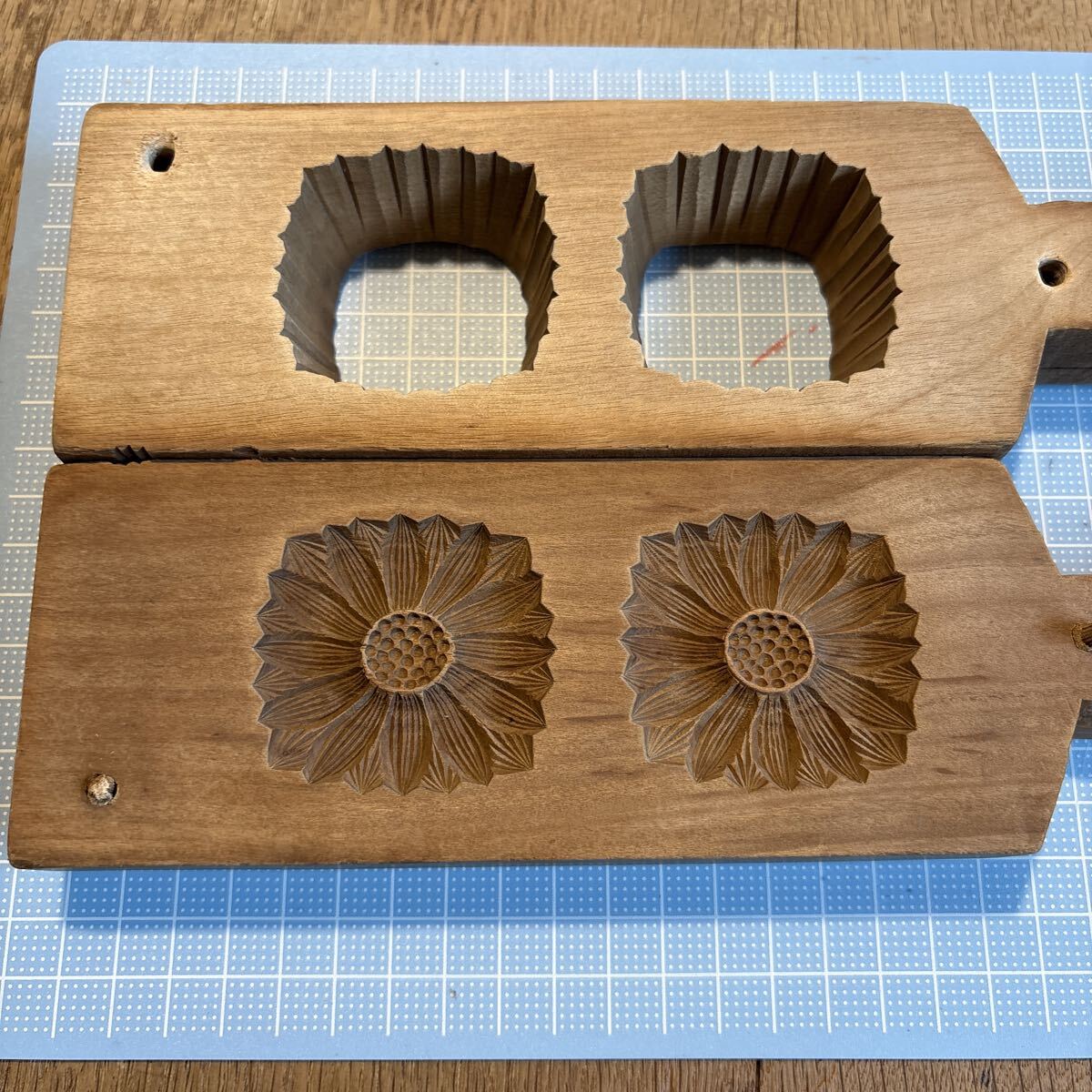 - 古い木製 菓子型 木型 菊 花 縁起物 正月 和菓子 落雁 ねりきり 型抜き 木枠 昭和レトロ