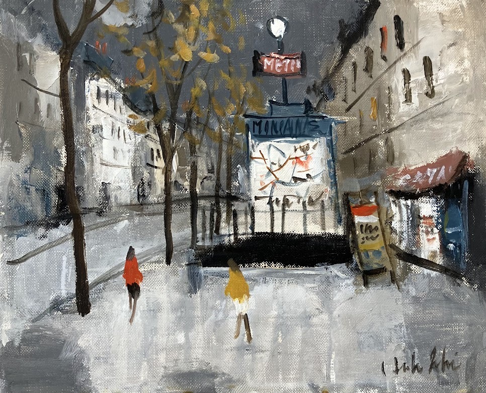 - 【真作保証】石黒秀治 『メトロのある通り』油彩画 油彩F3号 創元会会員 一枚の絵 人気画家 軽快な筆致でパリの街角を描く R7-0141