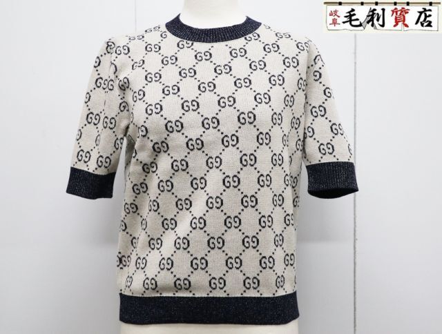 > グッチ GUCCI 692717 XKB54 GGラメ ジャカード トップ サイズM グレー ネイビー 極上美品 ニット 半袖