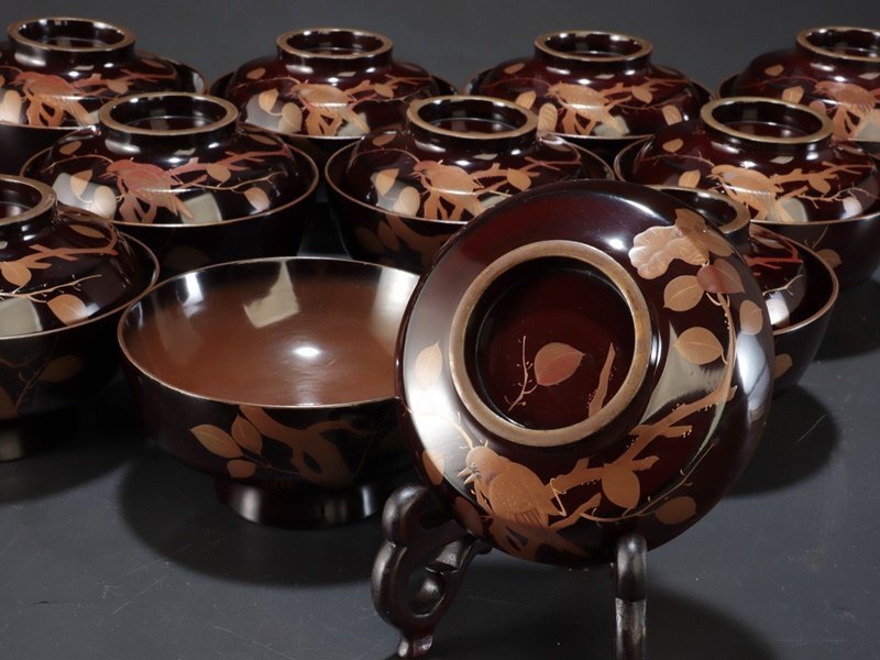 ■【夢讃岐】木製 蒔絵・吸物椀 10客揃(蓋10枚)Φ115 H55 wa950 ■ 商品詳細 御覧頂き、ありがとうございます。 【夢讃岐】木製 蒔絵・吸物椀 10客揃(蓋10枚)Φ115 H55 wa950 ○商品状態○経年あります。椀内に小傷みあるもの含みます。椀10客揃(蓋10枚)。 状態に関しては,充分に画像で確認の上、クレームの無い様に御入札下さい。 ○サイズ○ Φ--mm/高さ--mm ぐらい画像参照ください。 ○御一読下さい○2025年で、昭和100年です。私共の扱う品は、大半の物が半世紀から一世紀以前の品です。 新品と表記しない限り,確実に経年有りますので, 新品とは違い、擦れアタリ等は有るとお考え下さい。 また細かい見落とし等も時代古物とお考えの上御容赦下さい。 気になる箇所は、画像にもアップ致しますので、ご了承の上御入札下さい。 記載・画像掲載されてない,見落としに関しては、常識の範囲で誠意対応致します。 他にも漆器をメインに出品しておりますので、ぜひ御覧下さい 。