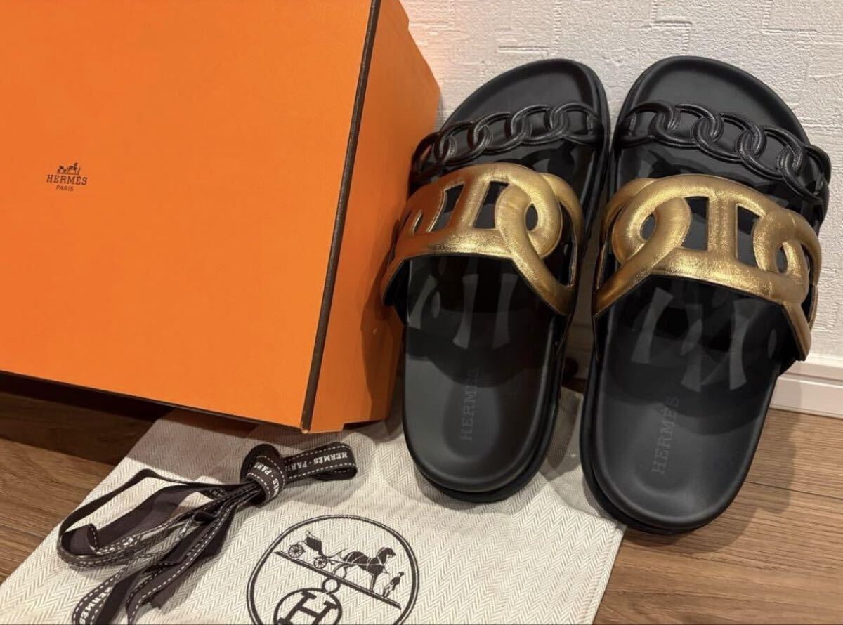 - HERMES サンダル ゴールド×ブラック★エクストラ シェーヌダンクル 23㌢