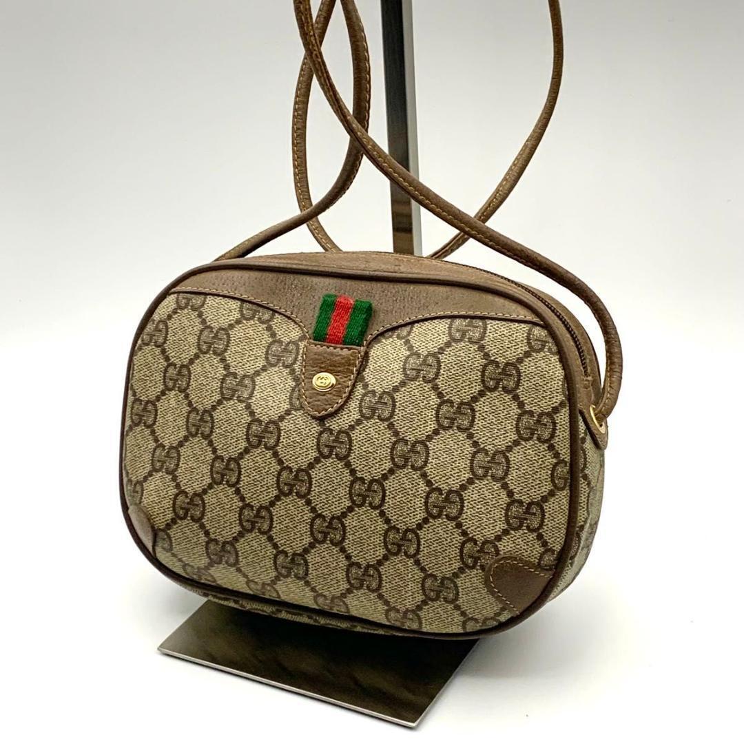 - 美品 グッチ ショルダーバッグ サコッシュ GG シェリーライン レザー 茶