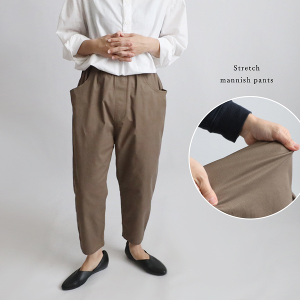> 秋のパンツ祭り 85cm ストレッチ伸縮コットンチノ生地 マニッシュ テーパード パンツ ペグ チノパン ブラウン H62