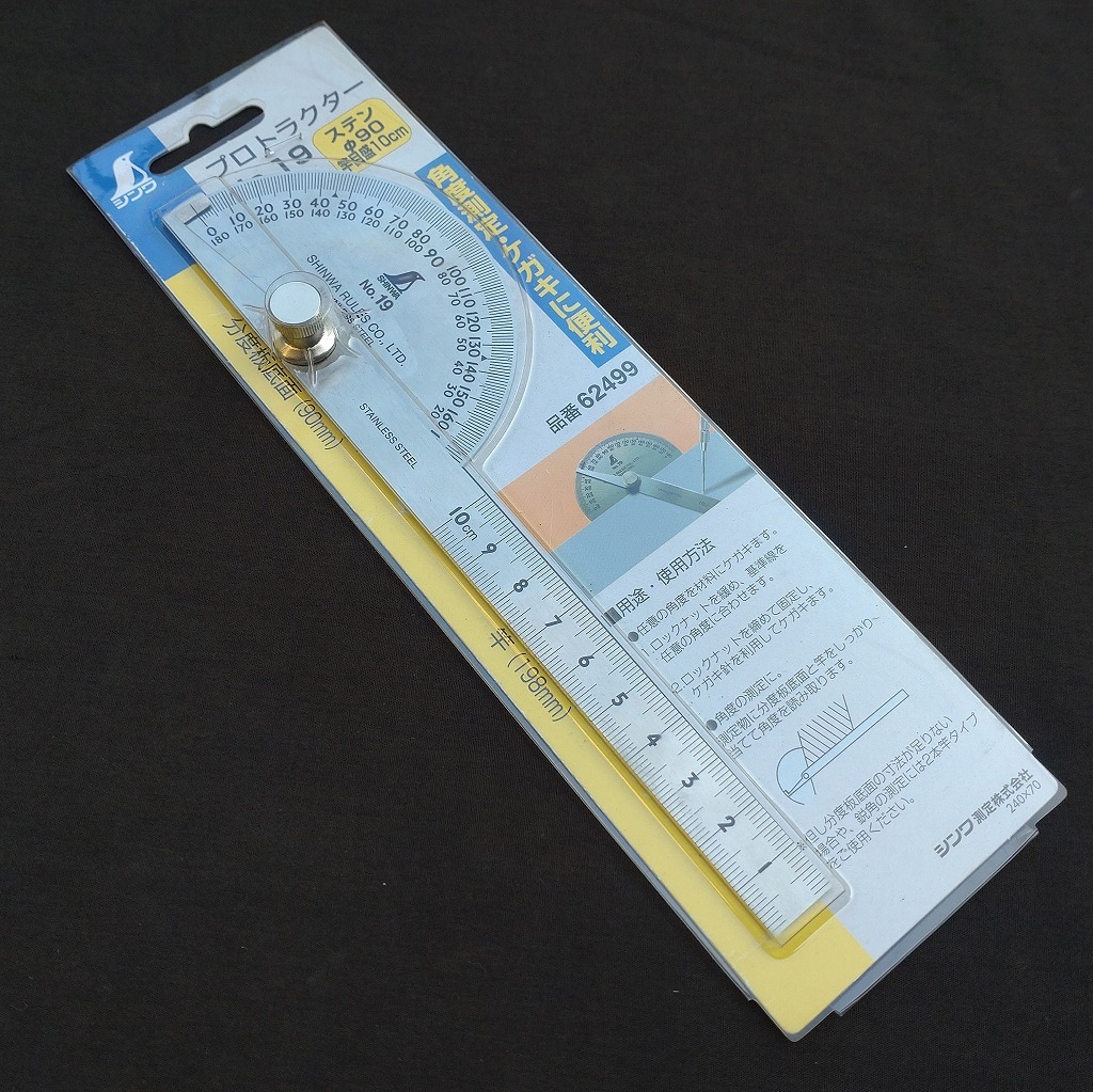 > シンワ プロトラクター No.19 分度板底面(90mm) 竿目盛10cm 角度測定・ケガキに便利 角時計 Shinwa 未使用保管品 【6319】