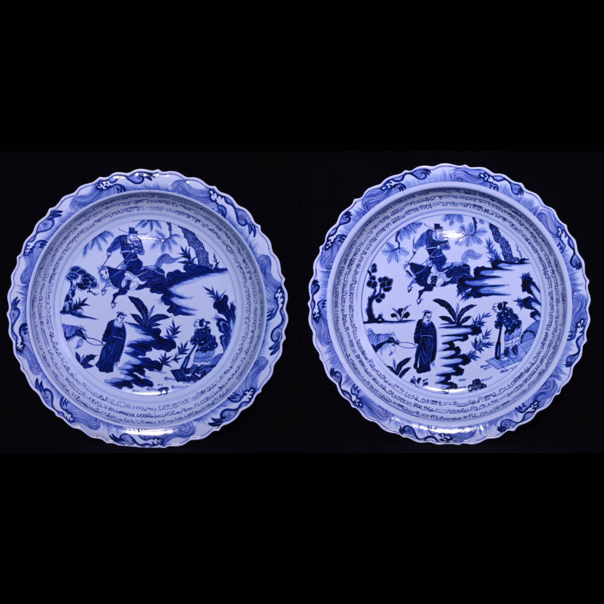 - TM9#8370【3.1】中国骨董 人間国宝 磁器【元青花蕭何月下追韓信人物故事紋賞盤一対】工芸品 施釉陶 青花磁 陶芸 精美彫 置物 收藏品