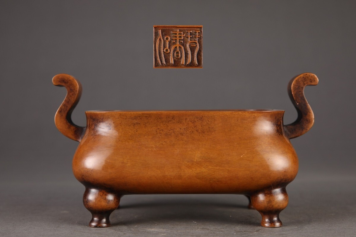 - 「明代 琴書侶 古銅彫 朝冠耳四方老銅香炉」旧銅器 置物擺件 賞物 中国古美術 旧蔵出