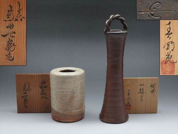 > ◆◇萩焼「七代 兼田天寵」造 花入 備前焼「春湖苑」造 一輪生(つる付) 一輪挿 花器 計2点 共箱付◇◆