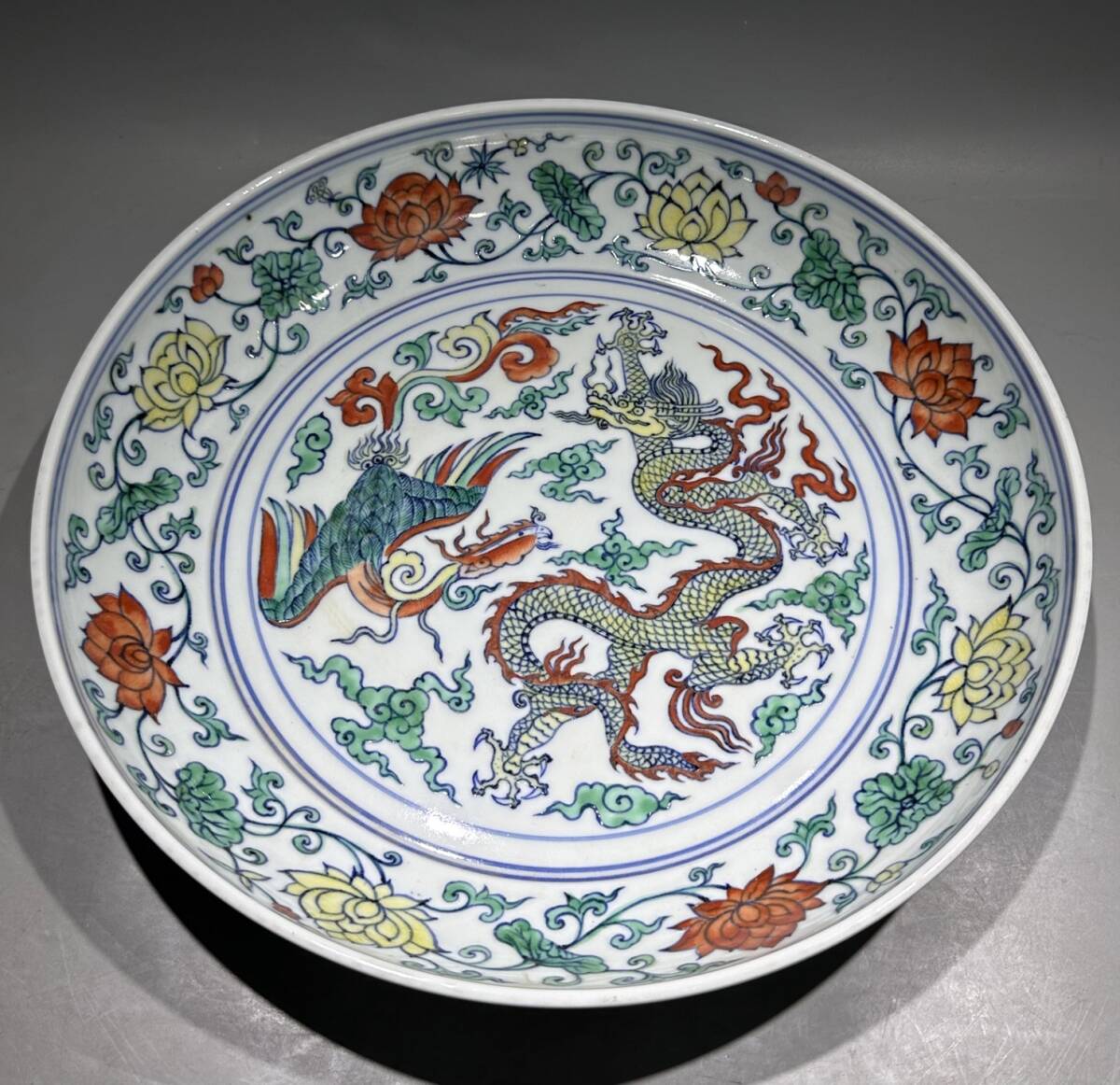 > ◆珍蔵◆中国古美術 大明宣徳年製 五彩 古陶磁 龍鳳紋大盤 美品 細密細工造 置物 擺件 古賞物 時代物 A26