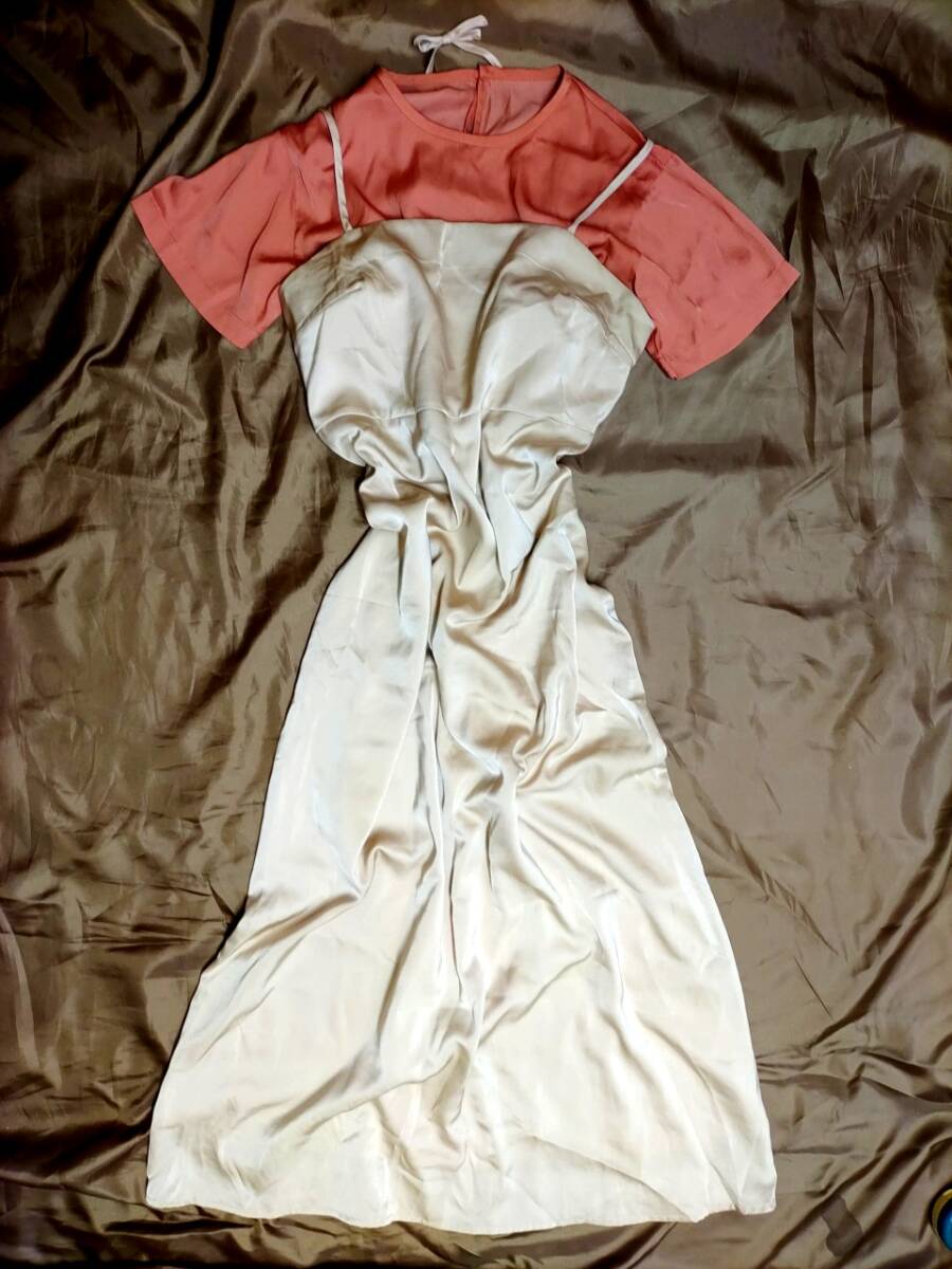 - メンズ様 女装 光沢サテンコーデ ブラウス ロングワンピース マキシ丈 ジャンパースカート つるつる すべすべ 清楚 フェチ 大きめフリー