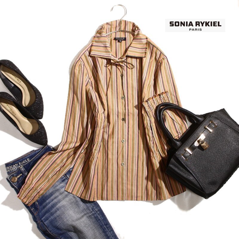 - 美品 ソニアリキエル SONIA RYKIEL マルチストライプ柄 レースアップ ウエストギャザー デザイン 長袖 シャツ 9号 38 ベージュ ブラウン