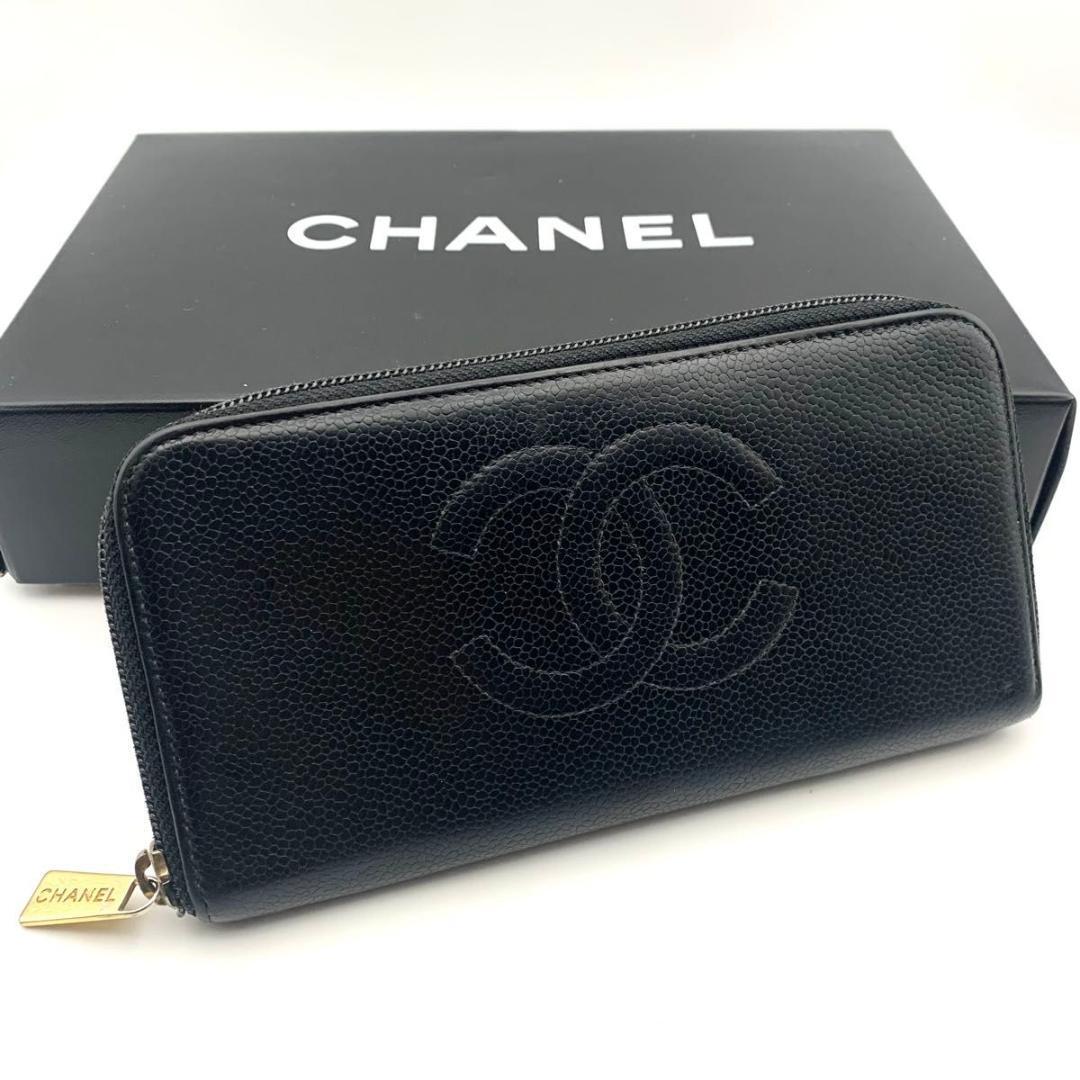 - 付属品完備 シャネル ラウンドファスナー 長財布 キャビアスキン レザー 黒