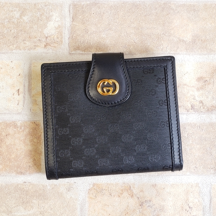 - 美品 オールドグッチ ヴィンテージ GG柄キャンバス レザー 折財布 イタリア製 ブラック PVCキャンバス GUCCI グッチ がま口 財布