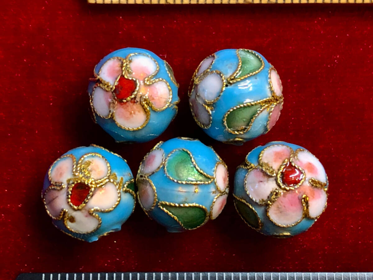 - ¶!¶ 有線七宝焼ワールド - 5個丸玉で1単位 ¶!¶ 約Φ12㎜ラウンド玉 金線に淡藍釉緑葉ピンク花 手作 手芸 工芸 インテリア 趣味