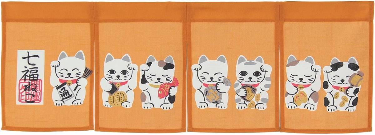 - 暖簾 のれん 七福ねこ 猫 ネコ 招き猫 七福神 和柄 縁起物(サイズ:約幅85cm×丈30cm ゴールド)