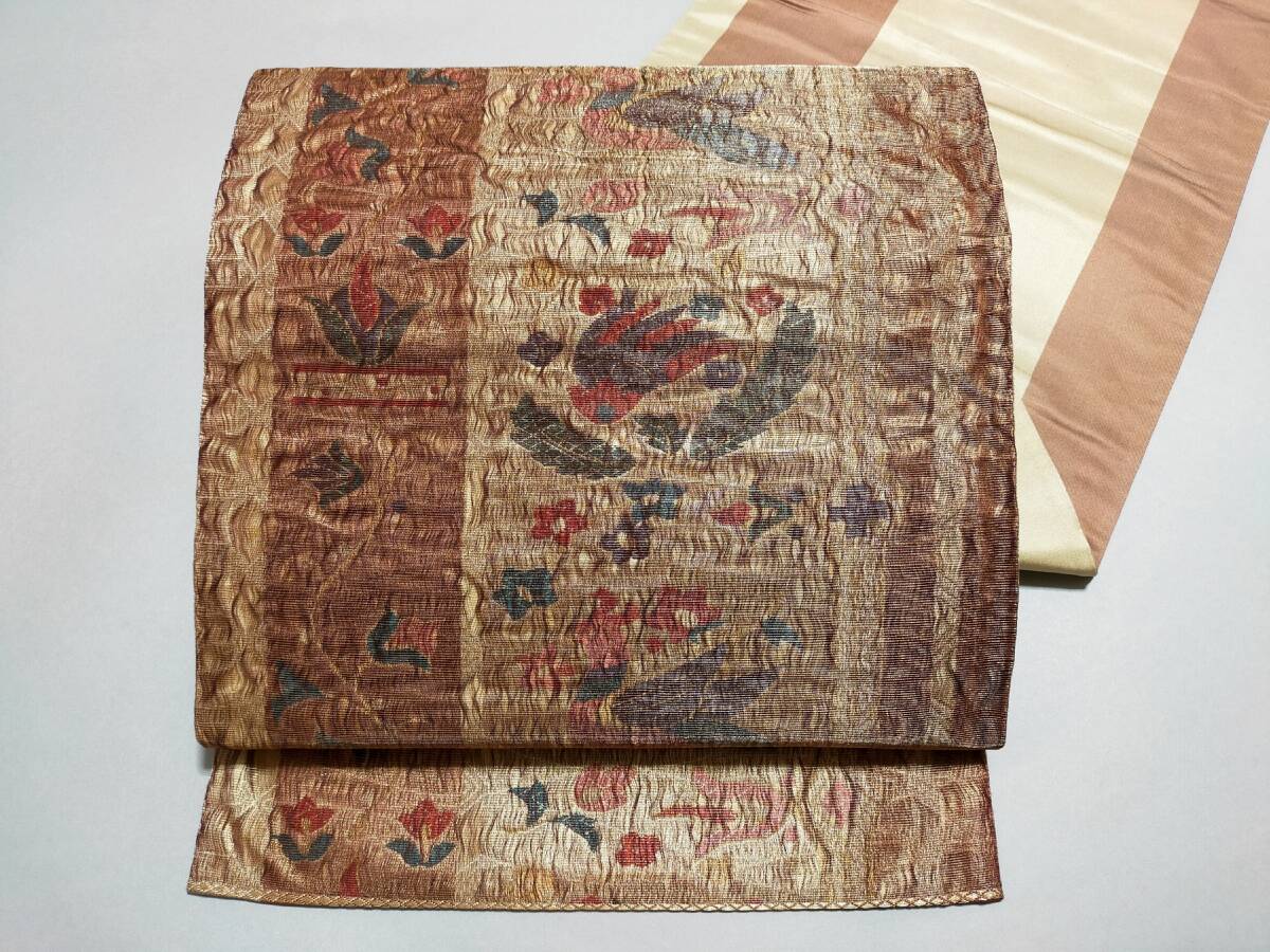 - FK13 袋帯 正絹 六通柄 すくい織 金糸 伽羅色地 鳥 草花 長4m25cm