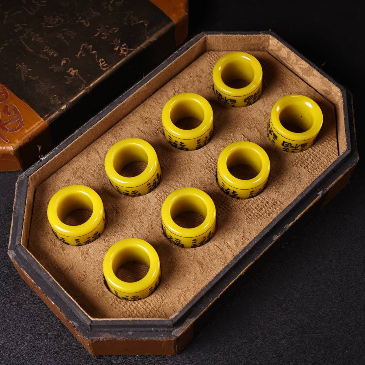 - 清時代 宮廷御製 黄玉彫 福字 親指 指環 指輪 套裝 箱付 時代物 東洋彫刻 旧家蔵出し 唐物 中国古玩 古美術品
