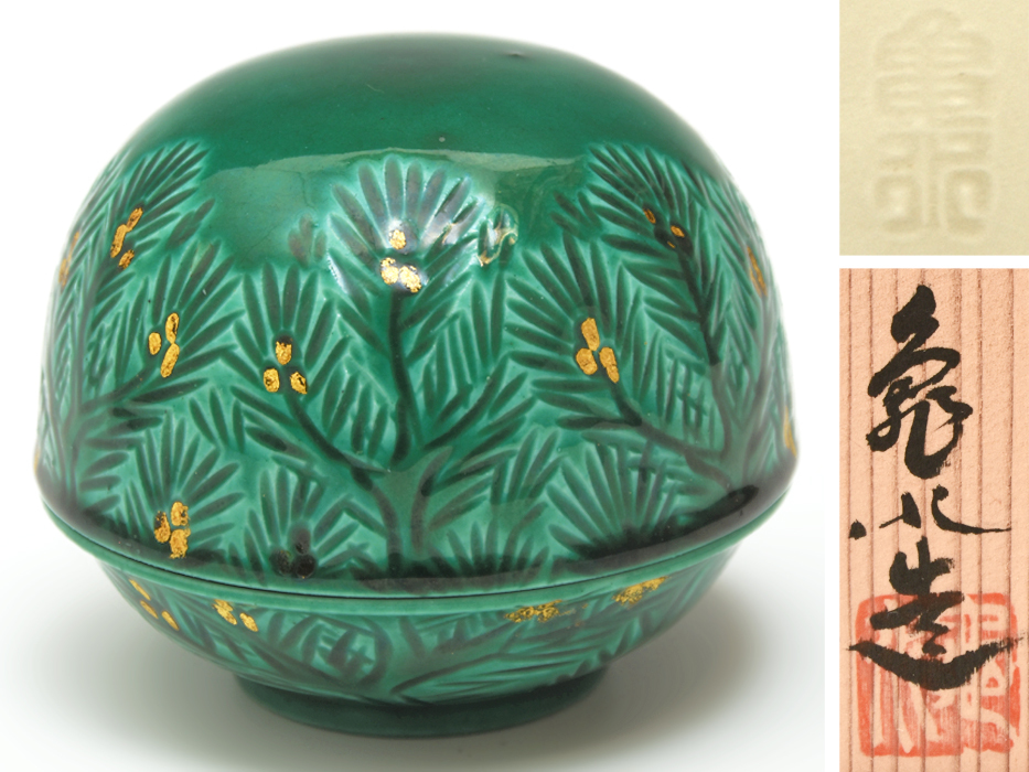 - 村田亀水 (造) 色絵若松文 大福入 共箱 共布 茶道具 煎茶道具 陶磁器 茶入 茶器 大服 京焼 u0932a