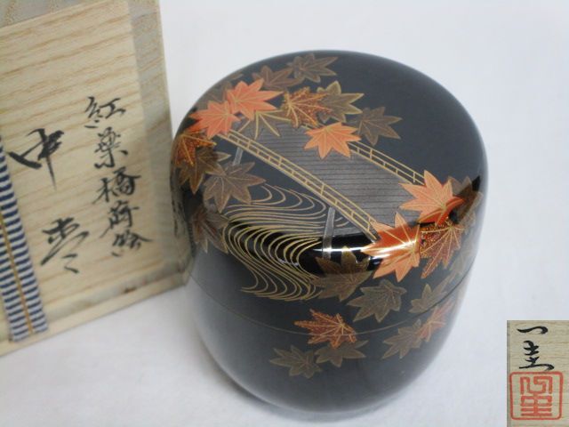 - 雉坂★【 輪島塗 紅葉橋蒔絵 中棗 浜高一圭 共箱 】茶道具・棗・薄茶器・抹茶入