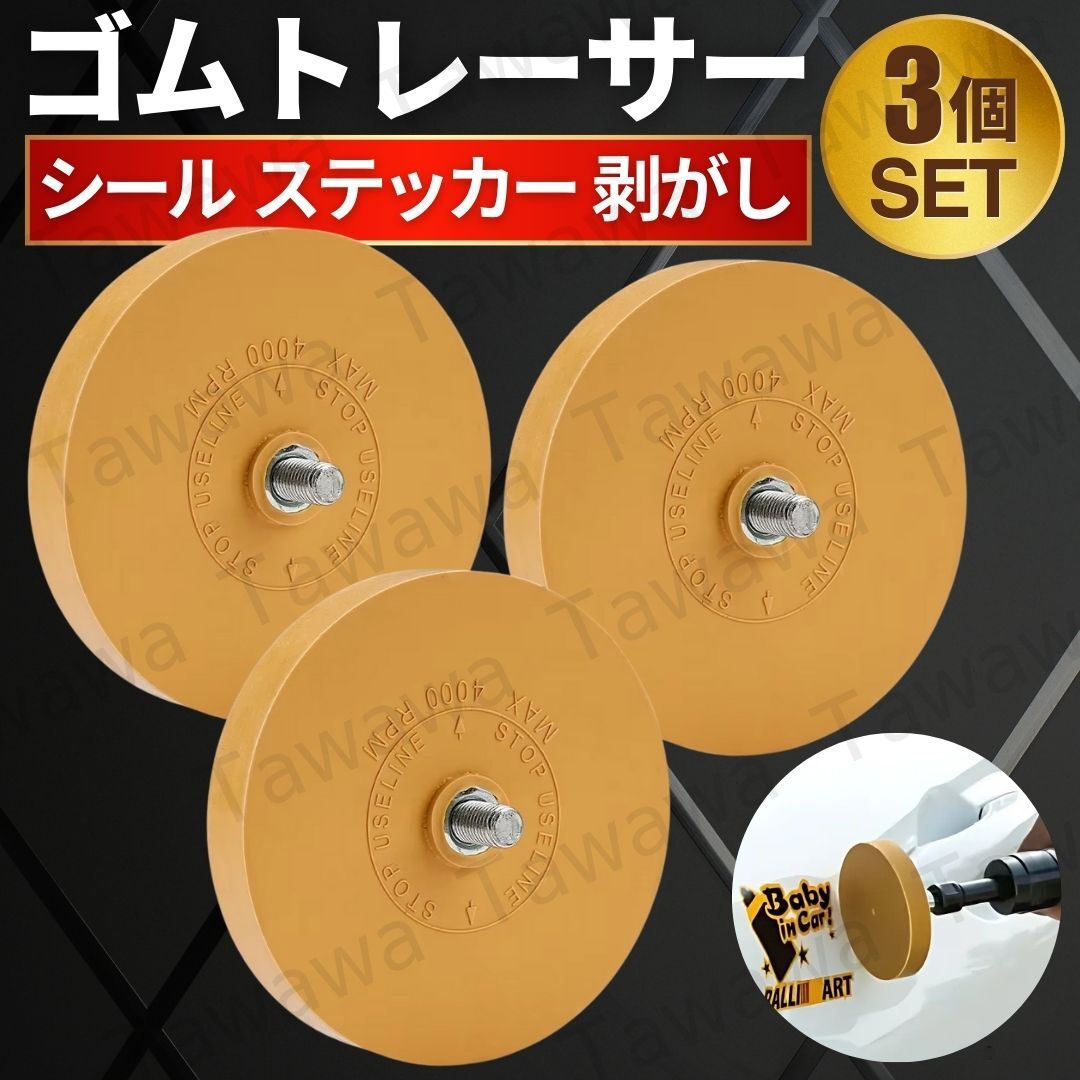 > ゴムトレーサー 3個 セット 車検 シール ステッカー 剥がし 粘着 剥し ドリル 装着 ドリルビット アダプター バランスウェイト イレイサー