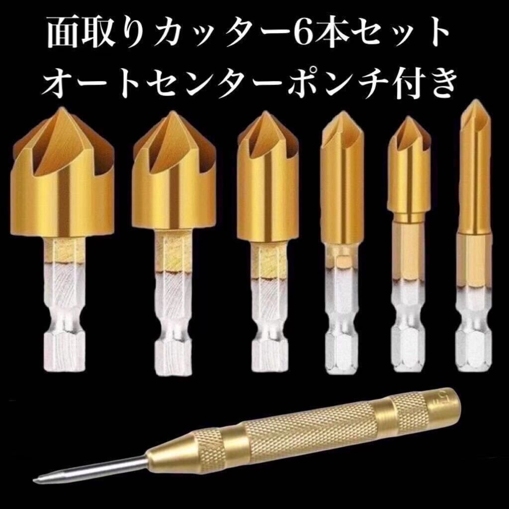 - N16 面取りカッター 6本セット オートセンターポンチ付き バリ取り 雑貨 ドリル 六角軸 ドリルビット DIY ビット 下穴錐 パーツ 工具
