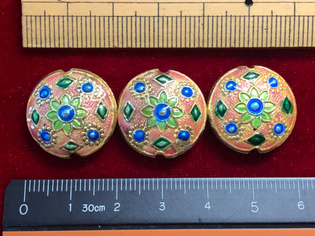- ¶!¶ 有線七宝焼ワールド - 3個の円盤型玉で1単位 ¶!¶ 約厚8㎜×Φ20㎜円盤型 金線に橙色釉雑色満天星花様 手作 手芸 工芸 インテリア