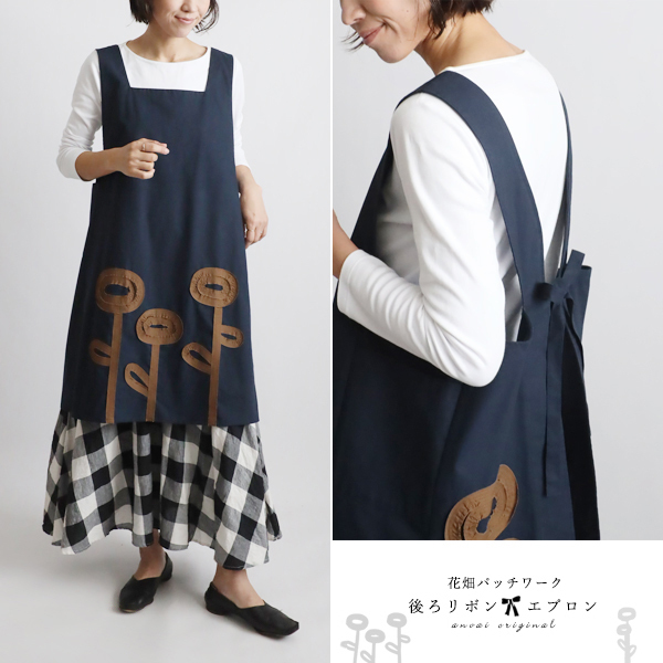 - 芸術の秋SALE 億劫な家事が楽しくなる 花畑エプロン パッチワーク 後ろリボン お洒落 DIY ゆったり ネイビー H75B